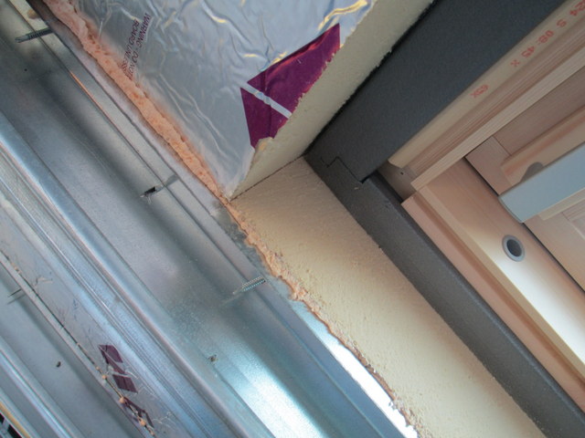 Velux from inside showing the grey insulated collar. Insulation will be cut back so the opening is horizontal to increase light.